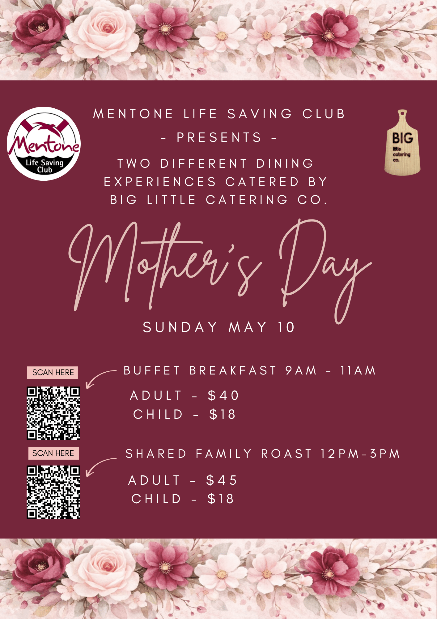 Celebrate Mother's Day at Mentone LSC Buffet Breakfast 9am-11am - Adult $40 Child $18 - click to book breakfast Shared Family Roast 12pm-3pm - Adult $45 Child $18 - click to book lunch