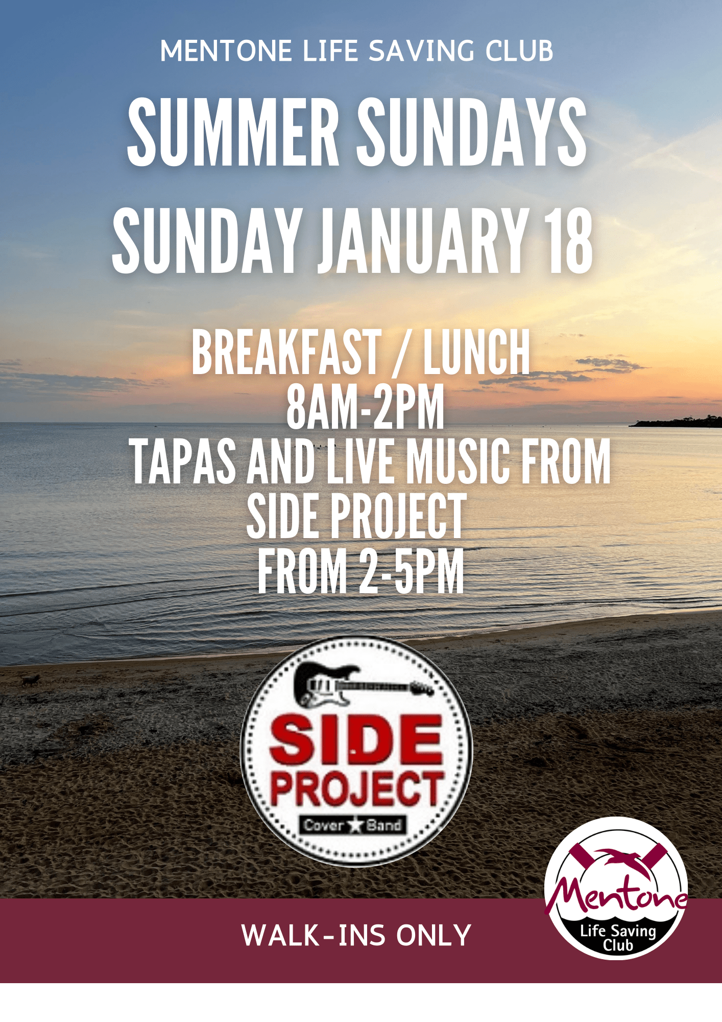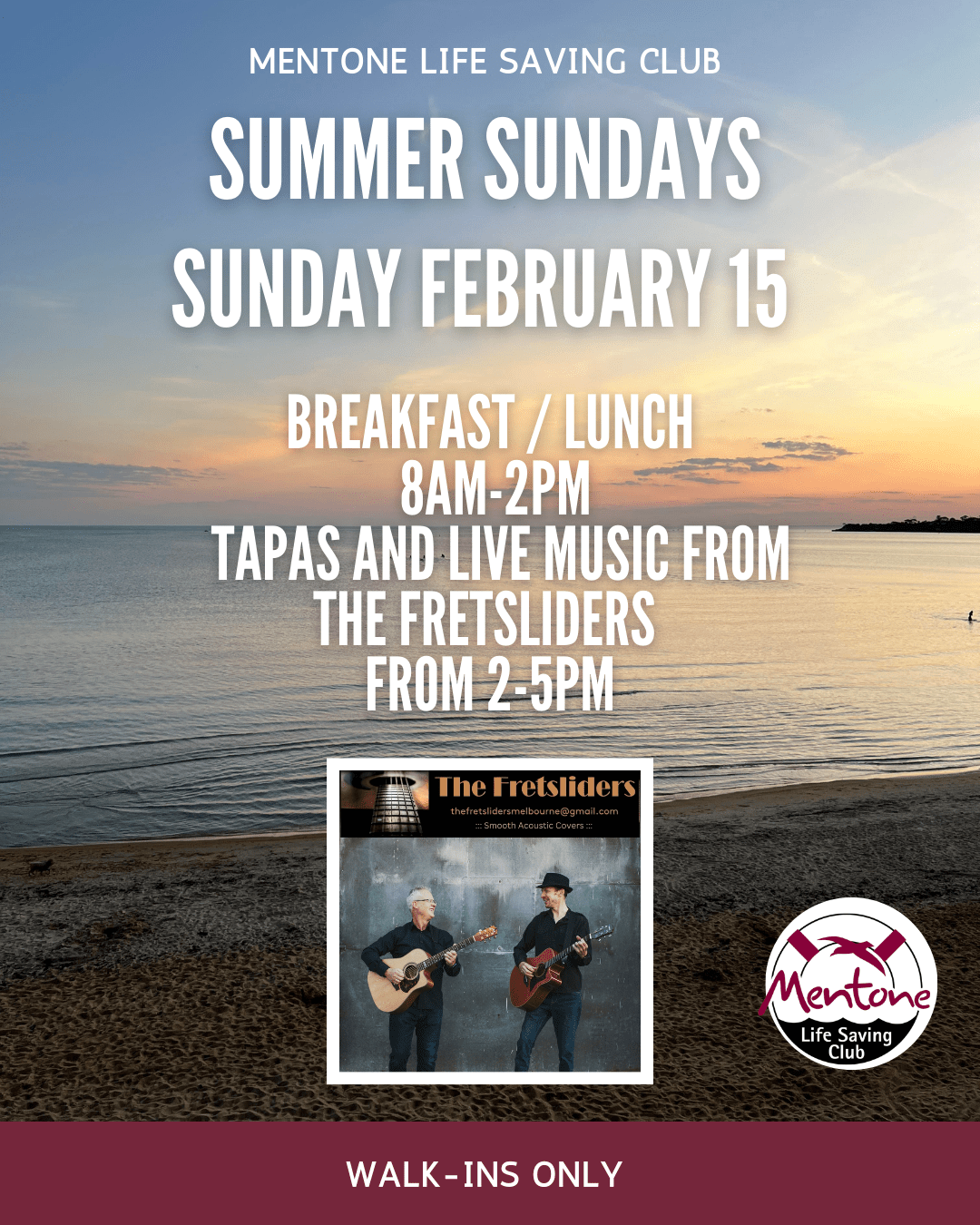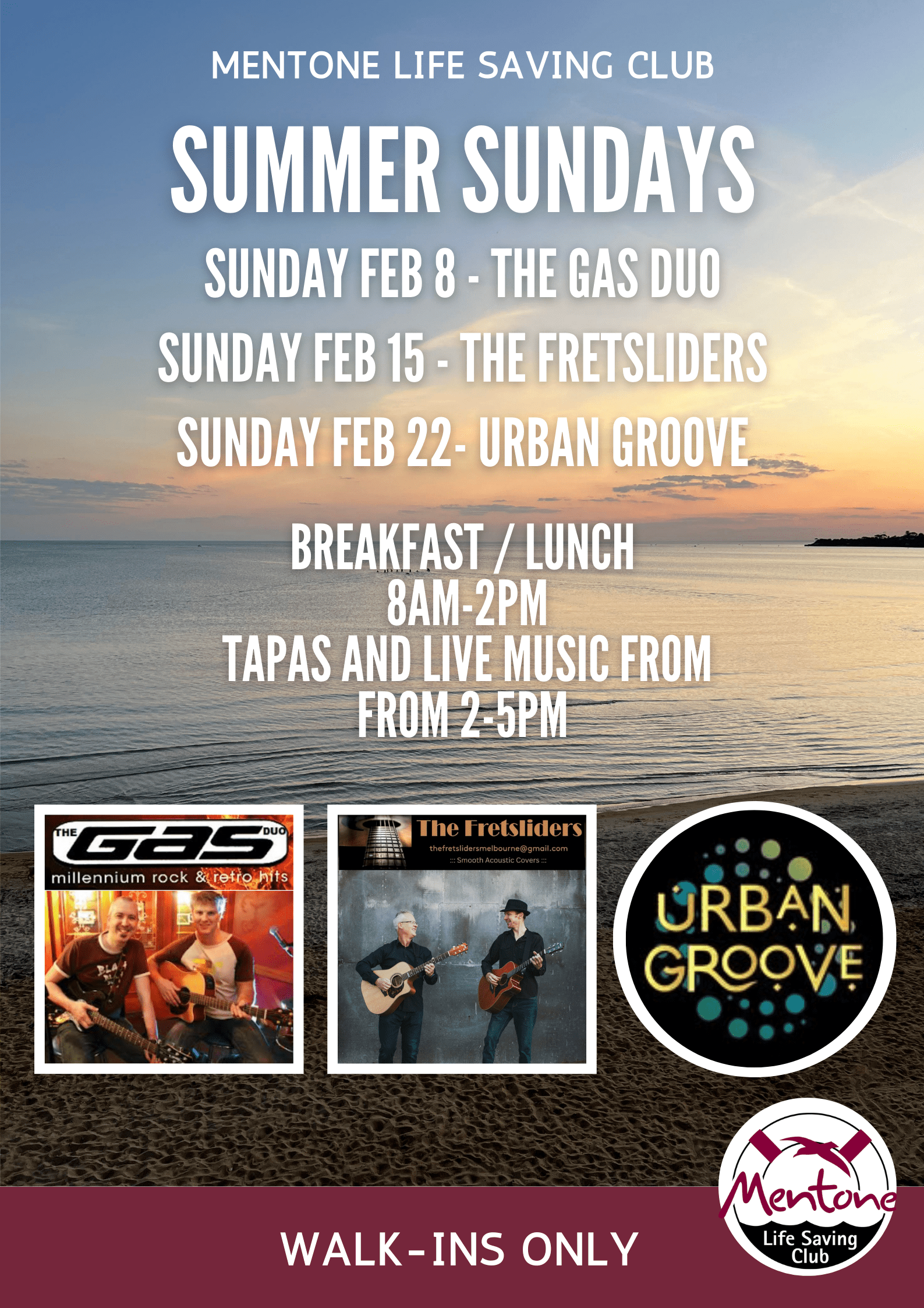 No Breakfast service as Beach Road closed for the 2XU triathlon event between 0600-1100. Downstairs Kiosk open from 9am. No bookings - Walk ins only Tapas and Live Music from the Gas Duo 2-5pm